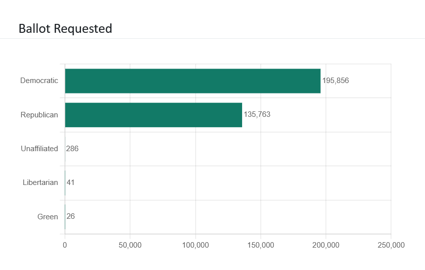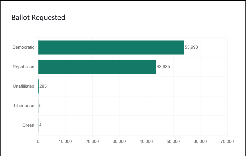 Most 2026 primary voters have requested Democratic ballots. 59% have requested Democratic ballots compared to 41% who have requested Republican ballots.