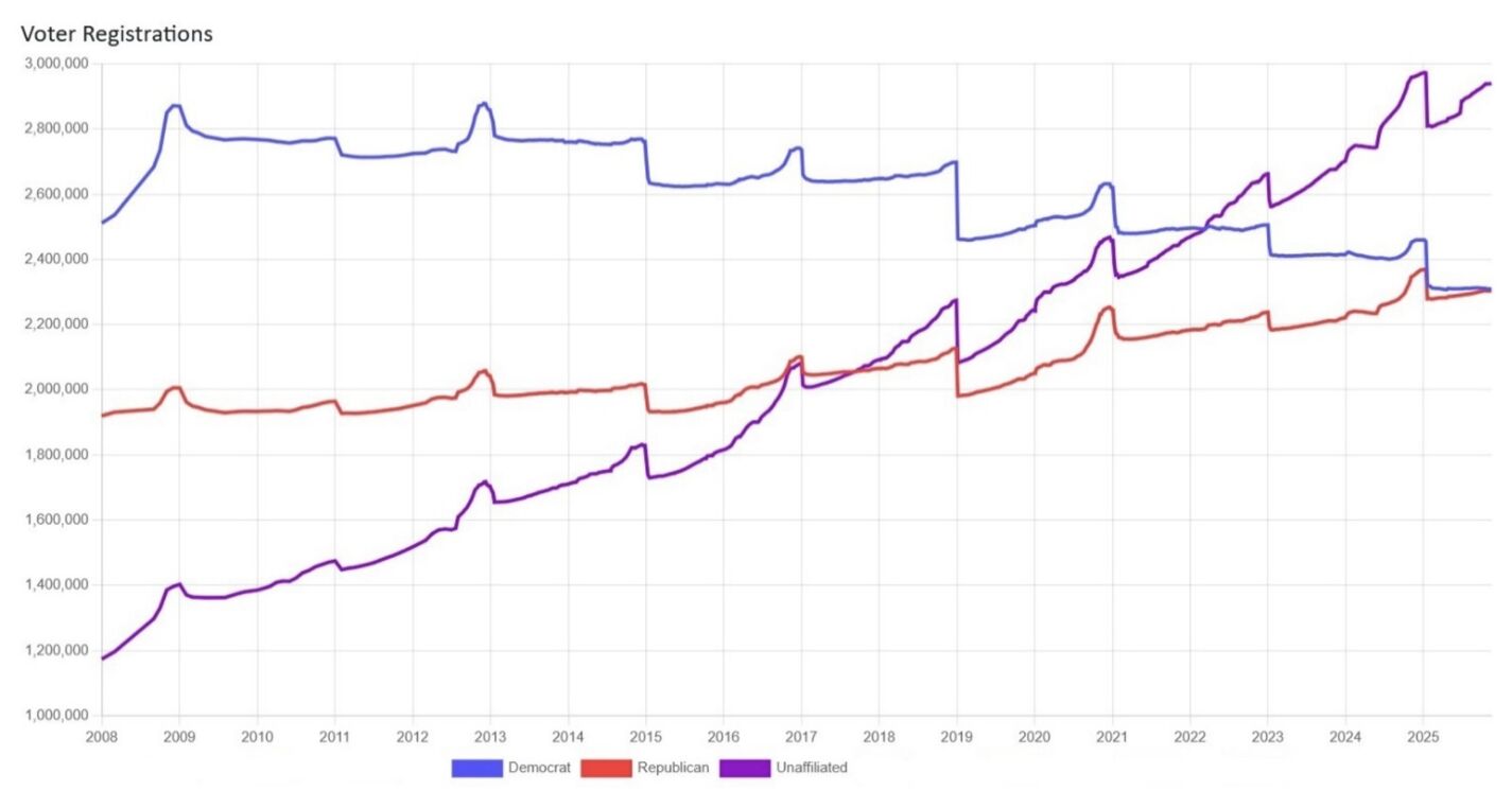 - The Democratic share of the electorate has declined for decades, while the number of Republicans in the state has increased