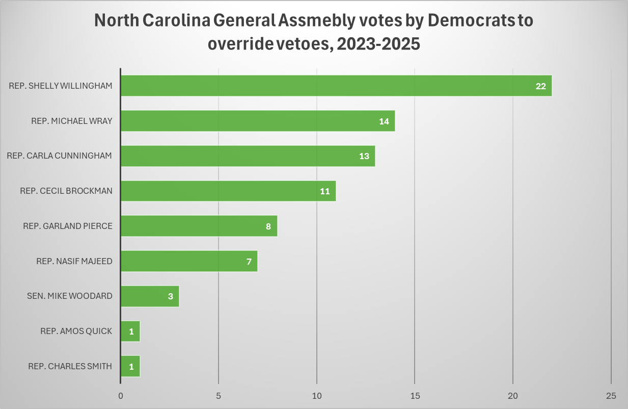 The proportion of Black legislators voting to override vetoes may have been inflated by the fact that two of the White legislators on the list, Rep. Michael Wray and Sen. Mike Woodard, lost their primaries in 2024. Neither of their replacements has voted to override a veto so far in 2025.